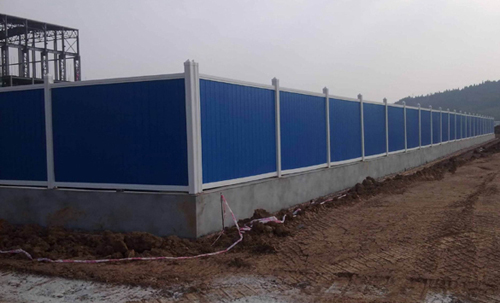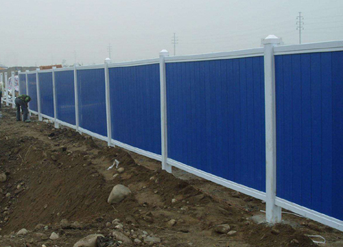 PVC施工圍擋由10塊雙層中空高強(qiáng)度PVC板組成,扣板厚度為20mm,藍(lán)色。
