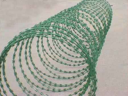 刀片刺繩也稱為刀片刺絲、刀片刺網(wǎng),是一種新型防護網(wǎng)。刀片刺網(wǎng)由熱鍍鋅鋼板或不銹鋼薄板沖壓出尖銳的刀片狀,高張力鍍鋅鋼絲或者不銹鋼絲做芯線組合而成的阻絕器材。由于刺網(wǎng)造形獨特不易觸摸,因而能達到極好的防護隔離效果.刀片刺繩按照安裝方法不同可分為:(蛇腹式) 螺旋式刀片刺繩,直線型刀片刺繩,平板式刀片刺繩,刀片刺繩焊接網(wǎng)等。刀片刺繩大略分為螺旋型、直線型、螺旋交叉型三種形式。