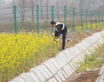 刺繩護欄網(wǎng)|刀片刺繩|刀片刺絲:引由全自動化的刺繩機擰編而成。民間俗稱鐵蒺藜。 成品種類: 單絲擰編和雙絲擰編。 原材料:優(yōu)質(zhì)的低碳鋼絲(電鍍鋅,熱鍍鋅,涂塑,噴塑)絲,有藍、綠、黃等顏色。用途: 用于草場邊界、鐵路、高速公路的隔離防護等。